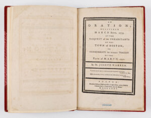 One of the most serious incidents preceding the American Revolution was the “Boston Massacre” of 1770, during which nine British soldiers fired on a crowd of more than 300 people, killing five colonists in Massachusetts Bay. Joseph Warren, a founding father, physician and one of the original members of Samuel Adams’ “Committees of Correspondence,” delivered this speech on the fifth anniversary of the event. In it, he argues that the Boston Massacre was proof of the inhumane actions of the British on the American people and insists that the colonists must defend their rights at all costs. The speech was later printed and sold for those not in attendance. Warren died not long after in the Battle of Bunker Hill.