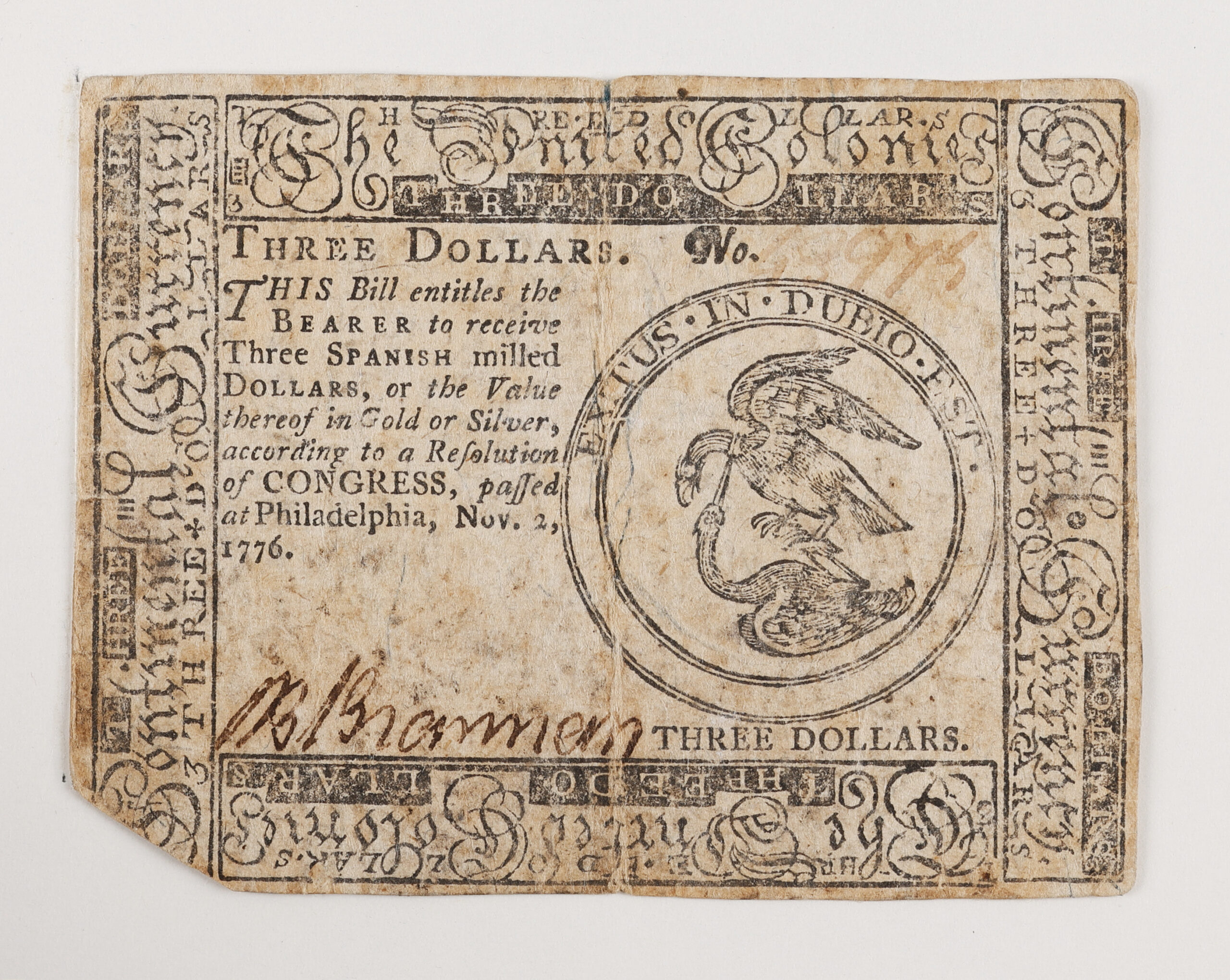 Also printed by Franklin’s press, this piece of currency marks an early attempt at creating unity amongst the colonies. Before the launching of a standard currency, each colony printed its own, forcing the Continental Congress to act. The front design on the fractional notes included the first use of the “FUGIO” (I fly) legend and sundial, as well as the “Mind your Business” legend. The back showed the 13 linked rings representing the colonies. These designs were created by Benjamin Franklin. The devices and border designs were cut by Elisha Gallaudet. Counterfeit detectors for the dollar denominations were made on blue paper. The paper, made at Ivy Mills in Chester County, Pennsylvania, contained blue fibers and mica flakes. This particular example was printed in 1776 and reads: “This bill entitles the bearer to receive three Spanish milled dollars, or the value thereof in gold or silver, according to a resolution of Congress, passed at Philadelphia, Nov. 2, 1776.”