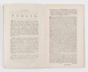 The Continental Congress was meeting in Philadelphia when British troops clashed with New England regiments at the Battle of Bunker Hill on June 17, 1775. When Congress learned of the battle one week later, even delegates who favored reconciliation were forced to reconsider their position—a forceful American response was necessary. Thomas Jefferson drafted an initial statement describing America’s position, which was then rewritten by moderate Pennsylvania delegate John Dickinson. Surprisingly, Dickinson’s version, which was approved by Congress on July 6, 1775, was even more forceful than Jefferson’s first draft. In the declaration, the thirteen colonial representatives resolve that while a war of independence can still be avoided, colonial Americans would sooner die than continue to live in slavery. The declaration was later printed in pamphlet form for the public.