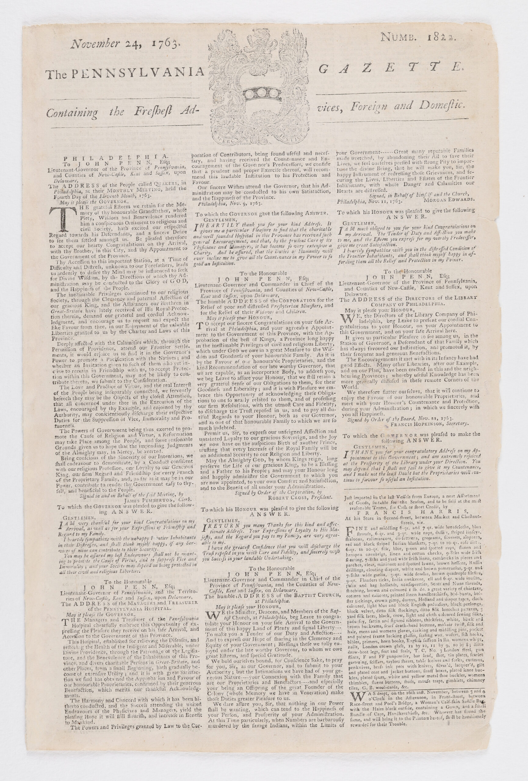 Philadelphia: Printed by B. Franklin and H. Meredith, 1763 [AN2 P4 U64 1763]