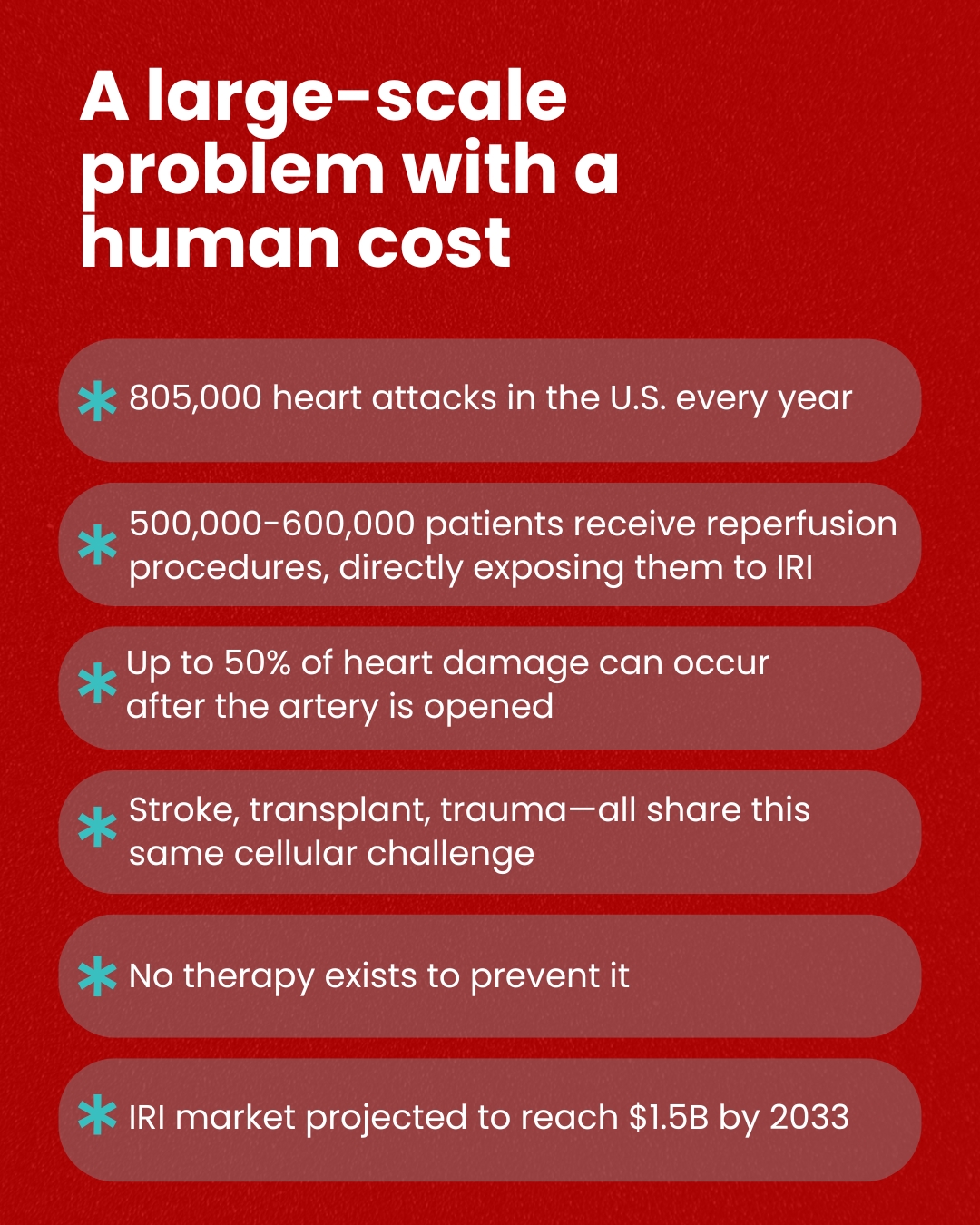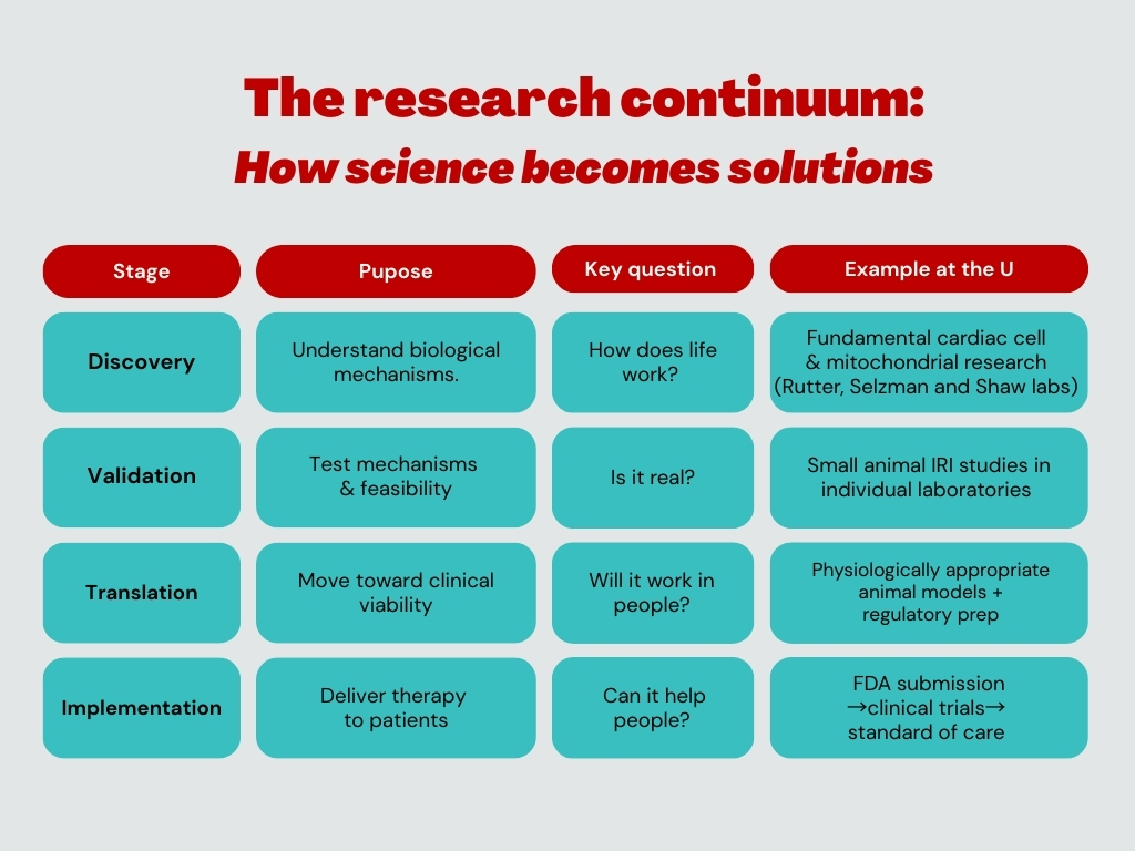 There is no approved therapy to prevent IRI, but hope is on the horizon. University of Utah scientists within the Nora Eccles Harrison Cardiovascular Research & Training Institute (CVRTI) have built a working system that moves discoveries toward the FDA pathway faster and more cost-effectively than industry. This is the foundation of the ASAP Project (American Science Acceleration Project), a model that tests three U-originated IRI therapies side-by-side in a 12-month, translational sprint.