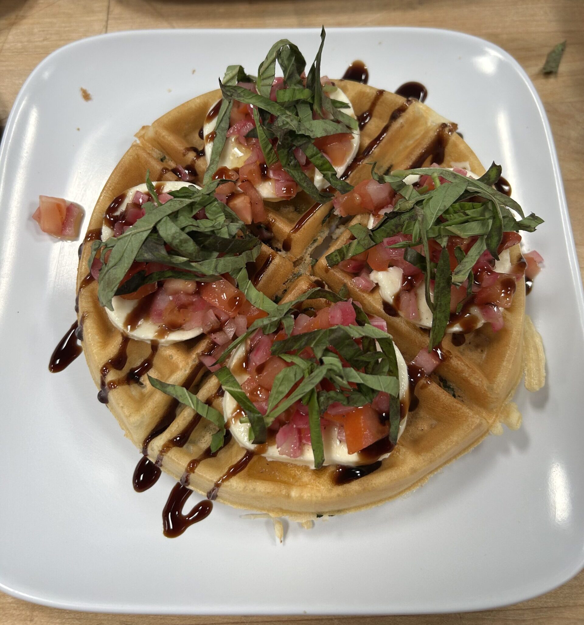 Iron Waffle features thick, warm waffles topped with sweet and savory choices like caprese or s’mores.