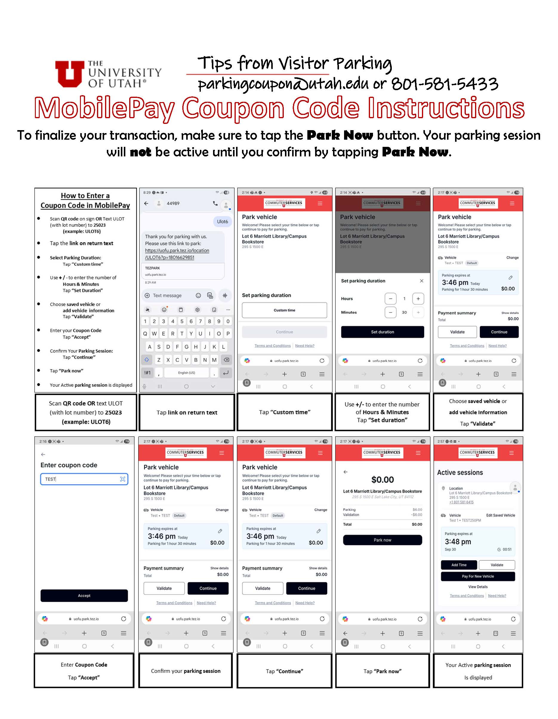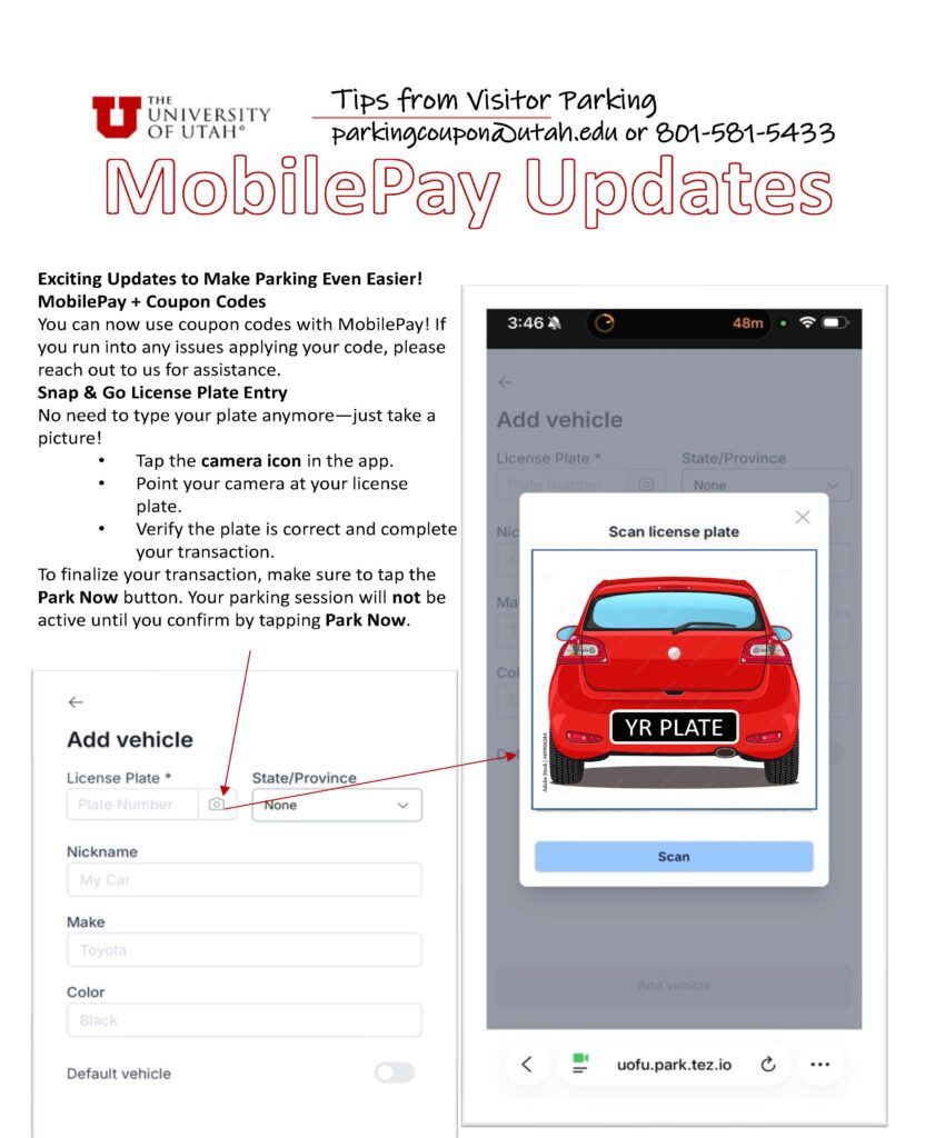 If you have any questions, feel free to reach out to us at parkingcoupon@utah.edu. To learn more about our transition from physical parking kiosks to MobilePay, visit our webpage. We’re here to help!