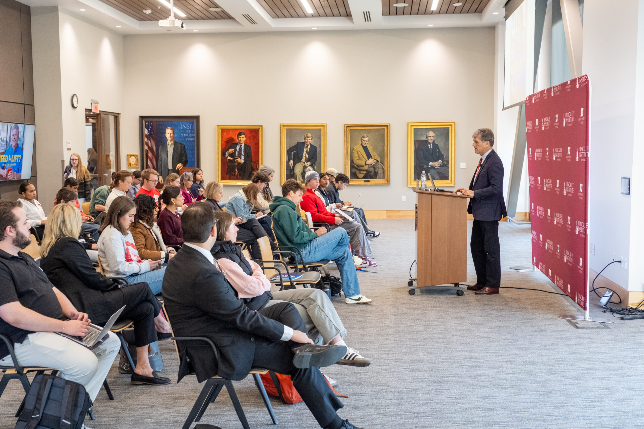 Gochnour urged students at the Societal Impact Seminar at Hinckley to engage with elected leaders. “All of you can make a huge difference by virtue of your education and your engagement,” she said.