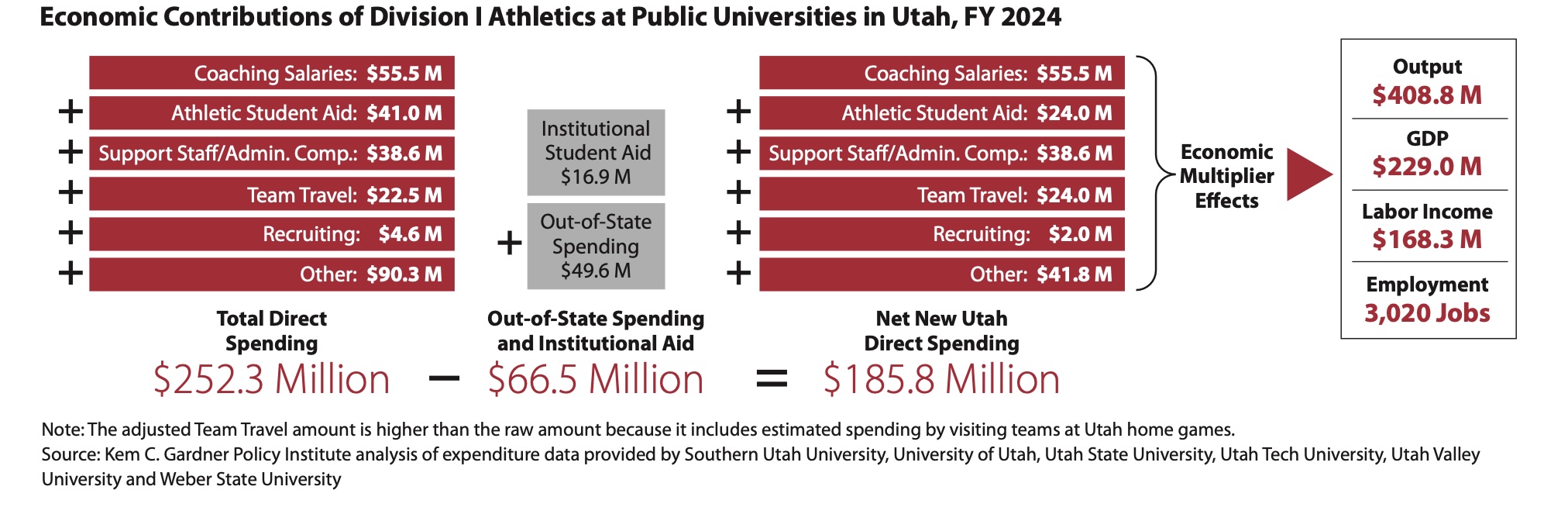 Across the state, Division I NCAA athletics programs help build community, both on and off campus, bolster success rates for student-athletes and accelerate institutional branding, according to a new report prepared by the University of Utah’s Kem C. Gardner Policy Institute. That’s in addition to the $19 million in ticket sales; $409 million in economic output, $229 million in gross domestic product and 3,020 jobs supported by intercollegiate sports at Utah’s six public universities.